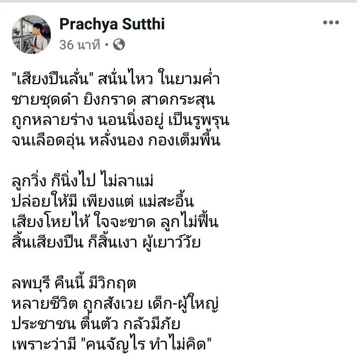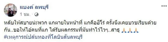 ล่าสุดเฟซบุ๊ก แบงค์ ลพบุรี โพสต์ข้อความระบุว่า หลับให้สบายน่ะพวก แกตายในหน้าที่ แกคือฮีโร่ ครั้งนึงเคยบวชเรียนด้วยกัน..ขอให้ไอ้คนที่แก ได้รับผลกรรมที่มันทำไว้ไวๆ..#เหตุการณ์ปล้นทองที่โลบินสันลพบุรี
