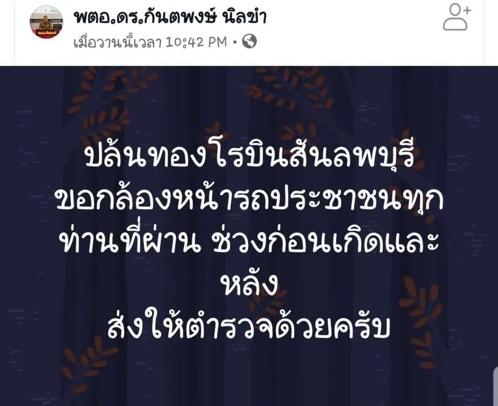 จากกรณีคนร้ายเป็นชายใส่เสื้อดำ สวมกางเกงลายพรางใส่รองเท้าคอมแบ็ต สวมหมวกไอ้โม่งใช้อาวุธปืน จี้ชิงร้านทองชื่อดังภายในห้างโรบินสัน อ.เมือง จ.ลพบุรี ขณะที่คนร้ายกำลังลงมือ ทางหัวหน้ารปภ.และรปภ. ทราบเรื่องจึงพยายามเข้าระงับเหตุจึงถูกคนร้ายยิงใส่จนมีผู้ได้รับบาดเจ็บ สาหัสหลายรายนั้น