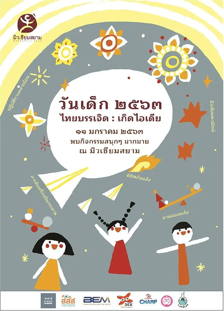 มิวเซียมสยาม ขอเชิญชวนคุณน้องๆ หนูๆ และครอบครัวมาร่วมเป็นนักคิด นักประดิษฐ์ถอดรหัสความเป็นไทยในกิจกรรมวันเด็กแห่งชาติ 2563 ตอน “ไทยบรรเจิด เกิดไอเดีย”โดยในปีนี้มิวเซียมสยามได้หยิบยกความเป็นไทยในห้องนิทรรศการ “ไทย Only” มาให้เด็กๆ ได้เรียนรู้ความเป็นไทยจากการเป็นคนช่างคิดช่างประดิษฐ์ ปรับปรุง ดัดแปลง และแก้ปัญหาได้อย่างดี เพื่อนำไปใช้ในการดำเนินชีวิต ผ่านฐานกิจกรรมสนุกๆ 4 ฐานกิจกรรม คือ 1.สารลับเครื่องบินกระดาษ 2.พิชิตภัยแล้ง 3.ปฏิบัติการคลายร้อน 4.มิวเซียมพาณิชย์