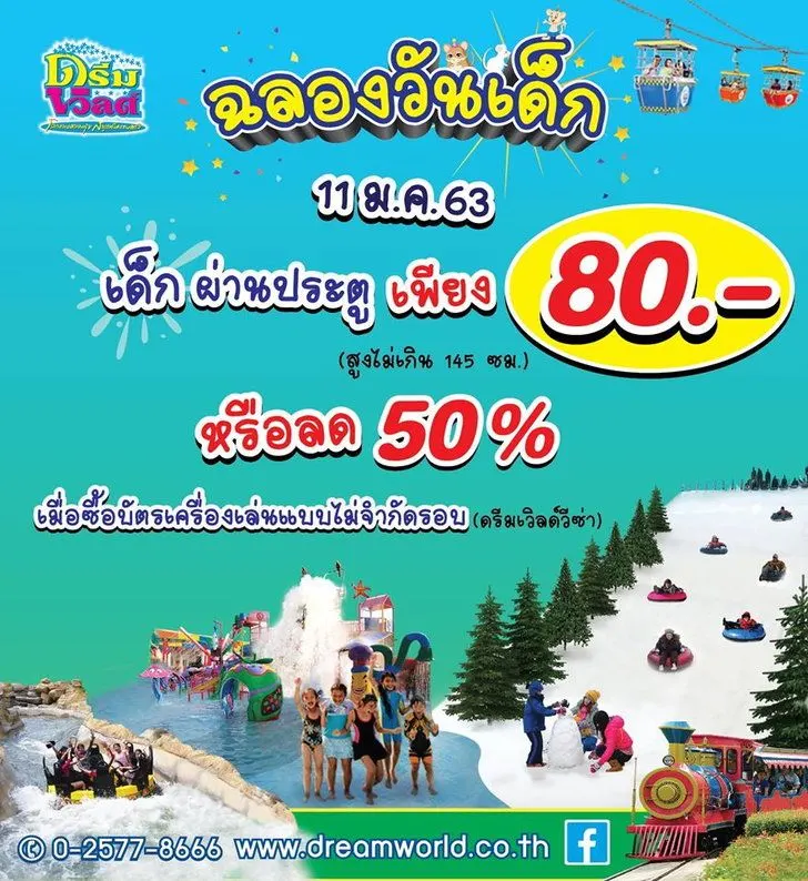 พบกับความสนุกสนานอย่างเต็มรูปแบบที่ Dream World สวนสนุกในตำนานของเมืองไทยขวัญใจเด็กๆ ในช่วงวันเด็ก 11 มกราคม 2563 นี้ Dream World เปิดให้เด็กๆ ได้เข้าชมในราคาแค่ 80 บาทเท่านั้น ไปสนุกสนานกันได้ตลอดทั้งวัน
