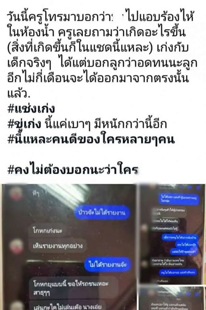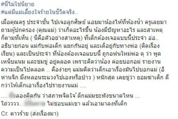 โดยมีข้อความระบุว่า เมื่อคุณครูประจำชั้นไปเจอลูกศิษย์แอบมาร้องไห้ที่ห้องน้ำ ครูเลยมาถามผู้ปกครอง คุณแม่ ว่าเกิดอะไรขึ้น น้องมีปัญหาอะไรและสาเหตุก็ตามที่เห็นนี่คือตัวอย่างสาเหตุ ที่เด็กต้องเจอแบบนี้ประจำ ที่น้องต้องเจอแบบนี้ ถูกแฟนใหม่พ่อ ดุว่าพูดเหน็บแนมและข่มขู่ อยู่ตลอด หนักสุด เคยขู่ว่ายอมฆ่าเด็กดีกว่าให้เด็กเอาเรื่องไปรายงานแม่