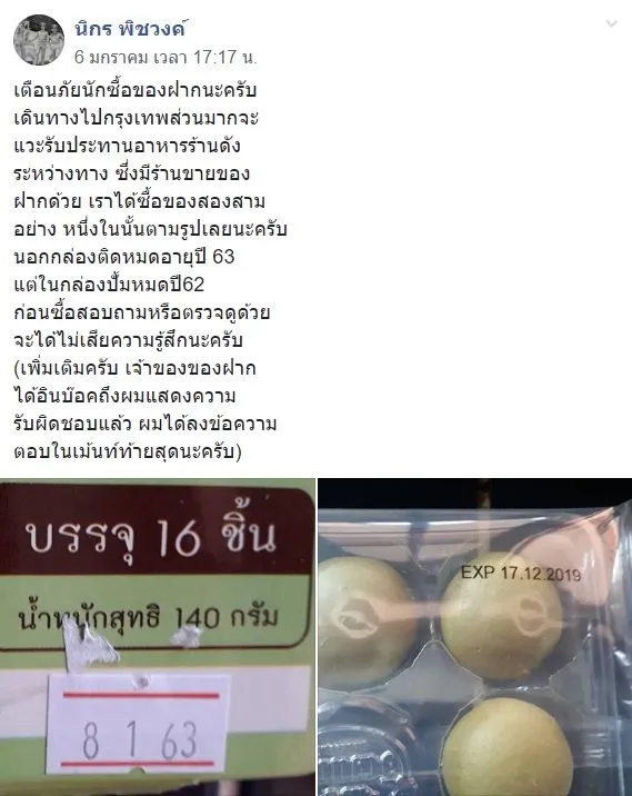 ผู้ใช้เฟซบุ๊กโพสต์ข้อความระบุว่า “เตือนภัยนักซื้อของฝากนะครับ เดินทางไปกรุงเทพส่วนมากจะ แวะรับประทานอาหารร้านดัง ระหว่างทาง ซึ่งมีร้านขายของ ฝากด้วย เราได้ซื้อของสองสามอย่าง หนึ่งในนั้นตามรูปเลยนะครับ นอกกล่องติดหมดอายุปี 63 แต่ในกล่องปั้มหมดปี 62 ก่อนซื้อสอบถามหรือตรวจดูด้วย จะได้ไม่เสียความรู้สึกนะครับ (เพิ่มเติมครับ เจ้าของของฝากได้อินบ๊อคถึงผมแสดงความ รับผิดชอบแล้ว ผมได้ลงข้อความตอบในเม้นท์ท้ายสุดนะครับ)”