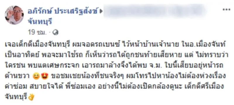 วันนี้เราจะพามาพบกับเรื่องราวดีๆที่เกิดขึ้นในสังคม หลังการที่ได้ฟังได้เห็นกันแต่ข่าวไม่ดีกันไปแล้ว เรื่องราวต่อไปนี้เป็นเรื่องราวของชายคนหนึ่ง ที่จอดรถไว้แต่อยู่ๆก็มีจดหมายเขียนติดไว้หน้ารถ เมื่อวันที่ 10 มกราคม ผู้ใช้เฟสบุ๊ครายหนึ่งใช้ชื่อว่า อภิรักษ์ ประเสริฐสังข์ ได้โพสต์ข้อความระบุว่า เจอน้องพลเมืองจันทบุรี ผมจอดรถเบนซ์ ไว้หน้าบ้านเจ้านาย ในอ เมืองจันท์ เป็นอาทิตย์ พอจะมาใช้รถ ก็เห็นว่าบริเวณท้ายรถได้รับความเสียหาย แต่ ไม่ทราบว่าใครชน เอารถมาล้างจึงได้พบ จดหมาย ใบนี้เสียบอยู่หน้ารถด้านขวา ขอชมเชยน้องจริงๆ ผมโทรไปหาน้องไม่ต้องห่วงเรื่องค่าซ่อม สบายใจได้ พี่ซ่อมเอง อย่างนี้ไม่ต้องเปิดกล้องดูนะ คนดีศรีเมืองจันทบุรี