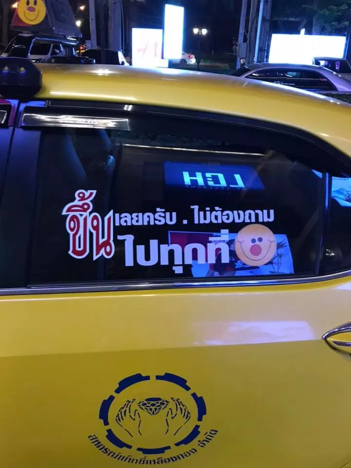 Taxi เมื่อคืนนี้ ยาวหน่อย เราก้าวขึ้นรถหลังจากบอกจุดหมายที่จะไปเรียบร้อยพูดถึงสติ๊กเกอร์ที่ติดไว้ข้างกระจกข้อความว่า “ขึ้นเลยครับ ไม่ต้องถาม ไปทุกที่”