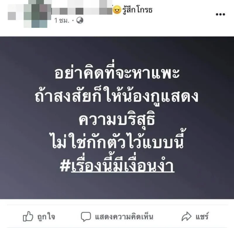 ล่าสุด เฟซบุ๊กรายหนึ่ง อาศัยอยู่ในจังหวัดลพบุรี โพสต์ข้อความระบุว่า อย่าคิดที่จะหาแพะถ้าสงสัยก็ให้น้องกูแสดงความบริสุทธิ์ไม่ใช่กักตัวไว้แบบนี้#เรื่องนี้มีเงื่อนงำ