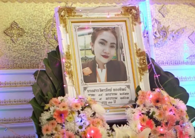 ต่อมาทีมข่าวเดินทางไปที่วัดศรีธรรมโสภณ ต นิคมสร้างตนเอง อ เมืองลพบุรี ซึ่งเป็นที่ตั้งบำเพ็ญกุศลศพของ นางสาว ธิดารัตน์ ทองทิพย์ อายุ 31 ปี พนักงานร้านทองที่เสียชีวิต โดยบรรยากาศเป็นไปด้วยความโศกเศร้า ซึ่งมีเพื่อนร่วมงาน ญาติพี่น้อง และหน่วยงานนำพวกหรีด ร่วมแสดงความเสียใจ