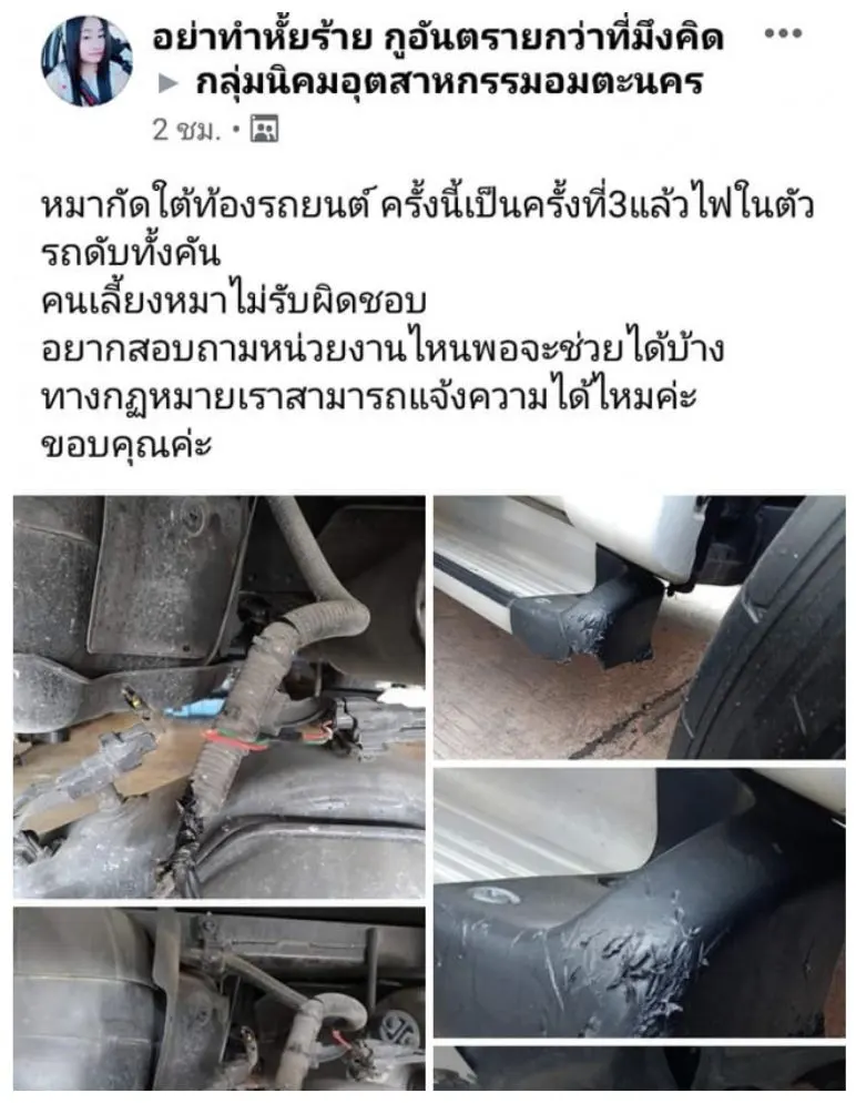 ผู้ใช้เฟซบุ๊ก อย่าทำหั้ยร้าย กูอันตรายว่าที่มึงคิด ได้โพสต์ระบุข้อความว่า หมากัดใต้ท้องรถยนต์ ครั้งนี้เป็นครั้งที่3แล้ว ไฟในตัวรถดับทั้งคัน