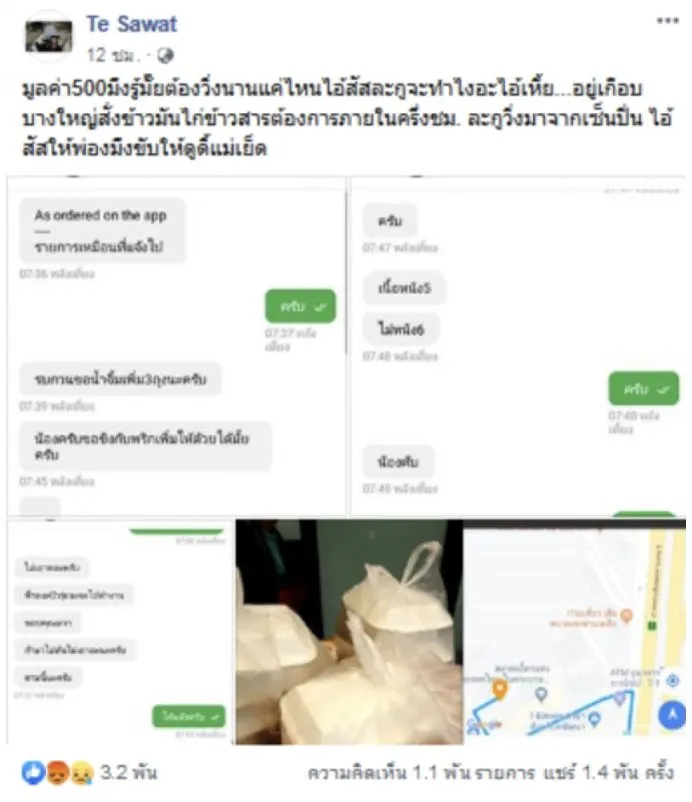 ผู้ใช้เฟซบุ๊ก Te ฆฟไฟะ ได้โพสต์ข้อความระบุว่า มูลค่า 500 คุณรู้ไหมต้องวิ่งนานแค่ไหน แล้วจะให้ผมทำไง อยู่เกือบบางใหญ่สั่งข้าวมันไก่ต้องการภายในครึ่งชั่วโมง แล้วต้องวิ่งมาจากเซ็นปิ่น