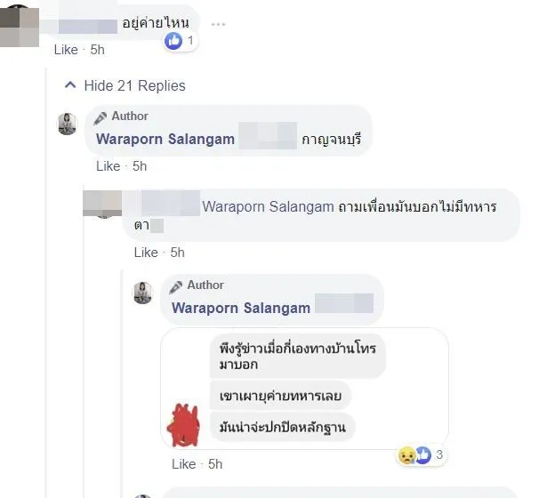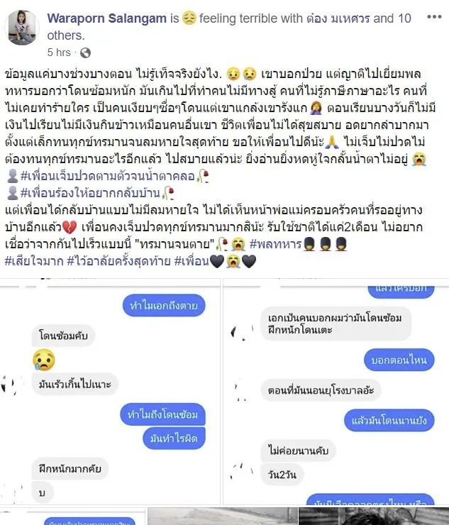 กรณีทางผู้ใช้เฟซบุ๊ค Waraporn Salangam เผยเรื่องราวสุดเศร้า ของเพื่อนคนหนึ่งที่เป็นทหารเเล้วโดนซ้อมหนักจนเสียชีวิต รับใช้ชาติได้แค่2เดือน ไม่อยากเชื่อว่าจากกันไปเร็วแบบนี้ ทรมานจนสิ้นใจ (โปรดใช้วิจารณญาณ ยังไม่ทราบสาเหตุที่มาที่ไปอย่างเเน่ชัด)