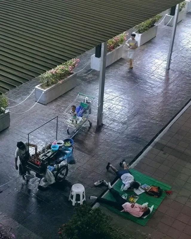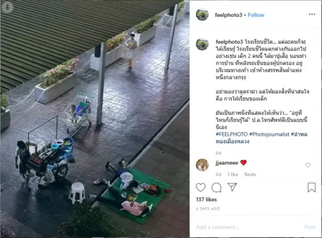 โรงเรียนชีวิต แต่ละคนก็จะได้เรียนรู้ โรงเรียนชีวิตแตกต่างกันออกไป อย่างเช่น เด็ก 2 คนนี้ ได้มาปูเสื่อ นอนทำการบ้าน ที่หลังรถเข็นของผู้ปกครอง อยู่บริเวณทางเท้า เข้าห้างสรรพสินค้าแห่งหนึ่งกลางกรุง