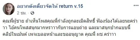 อย่างไรก็ตามหลังจากโพสต์ดังกล่าวถูกเผยแพร่ลงในโลกออนไลน์ ได้มีชาวเน็ตเข้ามาแสดงความเห็นวิจารณ์พฤติกรรมของหนุ่มเจ้าของโพสต์กันเป็นจำนวนมาก ที่ละเมิดสิทธิ์แอบถ่ายคลิปผู้อื่นแล้วนำมาโพสต์ด้วยแคปชั่นสนุกปาก ซึ่งล่าสุดผู้ใช้เฟซบุ๊กได้ปิดการใช้งานไปเป็นที่เรียบร้อย