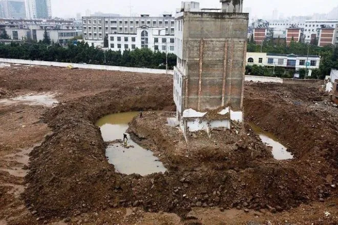 7.บ้านนี้เป็นบ้านที่เหลือเพียงหลังเดียวท่ามกลางกองดิน เค้าจึงถูกผู้รับเหมาขุดรอบบ้านเพื่อให้เป็นคูน้ำล้อมรอบเอาไว้ เพื่อกดดันและบังคับให้เจ้าของบ้านย้ายออกไปนั่นเองค่ะ
