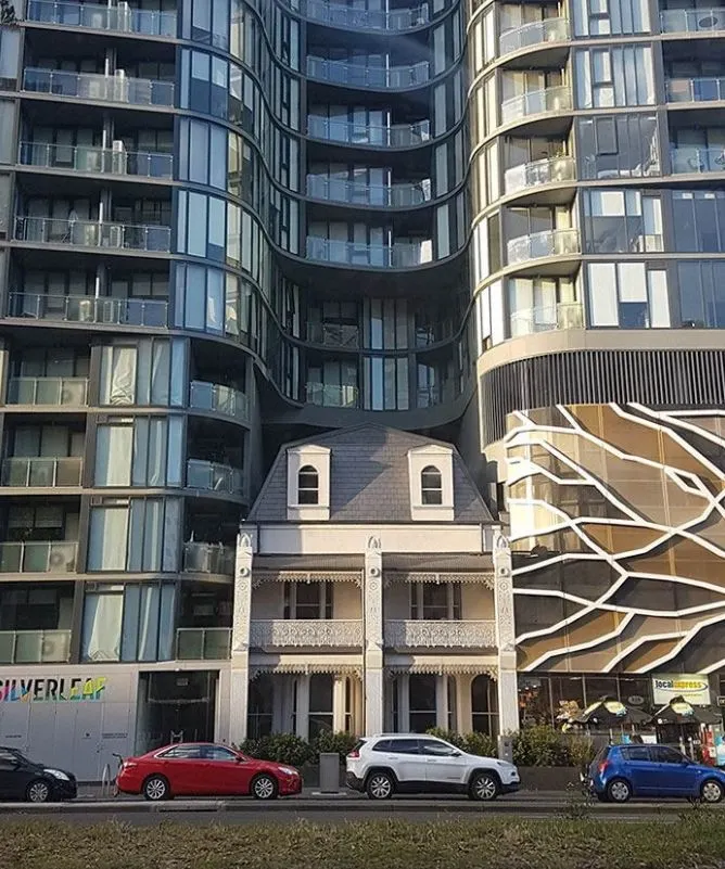 12.เจ้าของบ้านในเมลเบิร์น ประเทศออสเตรเลีย ที่ปฏิเสธจะขายบ้านให้กับเจ้าของอพาร์ทเมนท์แห่งนี้ จนต้องออกแบบตึกให้เป็นรูปทรงตามที่เห็น จริงๆก็สวยแปลกตาไปอีกแบบนะคะ