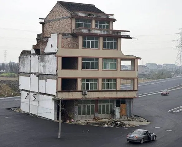 3.ถนนมอเตอร์เวย์ในประเทศจีนที่พึ่งสร้างใหม่ แต่ก็ต้องตัดถนนใหม่เมื่อพบกับบ้านหลังนี้ที่ขวางทาางกลางถนนโดยไม่มีทางหลบไปไหน และดูท่าทีว่าจะไม่ย้ายออกง่ายๆด้วยหละค่ะ