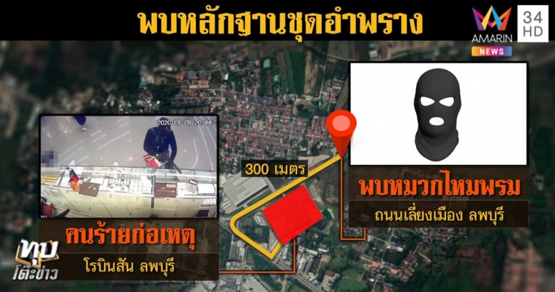 วันที่ 12 มกราคม 63 ทีมข่าวลงพื้นที่ย้อนรอยเส้นทางตามที่ตำรวจฝ่ายสืบสวน แกะรอยคนร้ายโจรโหดปล้นทองห้างโรบินสันลพบุรี ตรวจสอบพบหมวกไอ้โม่งต้องสงสัยถูกทิ้งบริเวณริมทาง ห่างจากห่างโลบินสันเพียง 300เมตร เบื้องต้น เจ้าหน้าที่ตำรวจได้เก็บหมวกต้องสงสัยไปตรวจสอบดีเอ็นเอ และเทียบเคียงกับภาพที่ใช้ก่อเหตุ