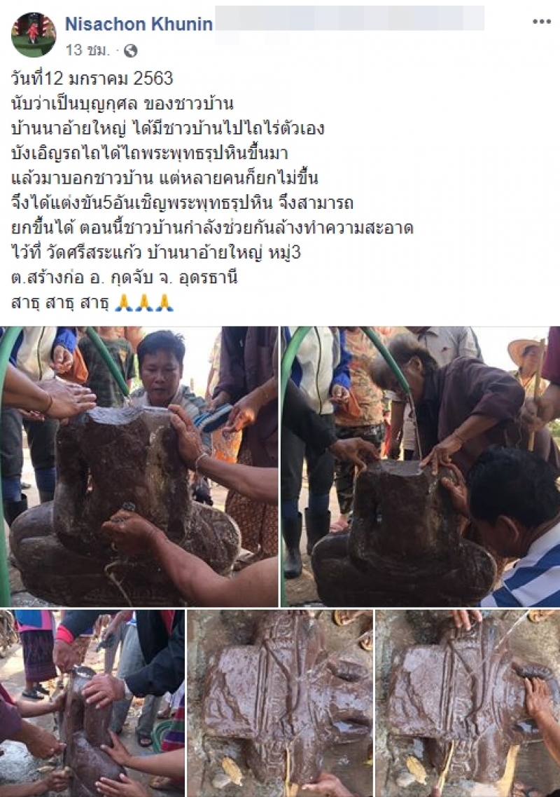 ผู้ใช้เฟซบุ๊กโพสต์ข้อความระบุว่า นับว่าเป็นบุญกุศล ของชาวบ้าน บ้านนาอ้ายใหญ่ ได้มีชาวบ้านไปไถไร่ตัวเอง บังเอิญรถไถได้ไถพระพุทธรูปหินขึ้นมา แล้วมาบอกชาวบ้าน แต่หลายคนก็ยกไม่ขึ้น จึงได้แต่งขันธ์ 5 อันเชิญพระพุทธรูปหิน จึงสามารถยกขึ้นได้ ตอนนี้ชาวบ้านกำลังช่วยกันล้างทำความสะอาดไว้ที่ วัดศรีสระแก้ว บ้านนาอ้ายใหญ่ หมู่3 ตำบลสร้างก่อ อำเภอกุดจับ จังหวัดอุดรธานี สาธุ สาธุ สาธุ