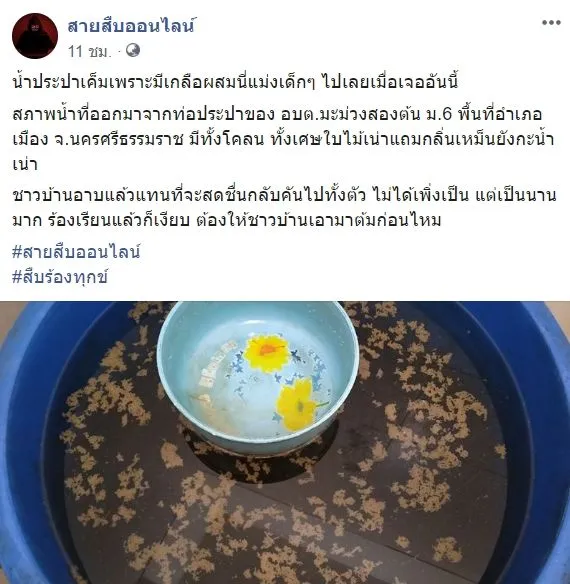 เพจเฟซบุ๊กโพสต์ข้อความระบุว่า “น้ำประปาเค็มเพราะมีเกลือผสมนี่แม่xเด็กๆ ไปเลยเมื่อเจออันนี้ สภาพน้ำที่ออกมาจากท่อประปาของ อบต.มะม่วงสองต้น ม.6 พื้นที่อำเภอเมือง จ.นครศรีธรรมราช มีทั้งโคลน ทั้งเศษใบไม้เน่าแถมกลิ่นเหม็นยังกะน้ำเน่า ชาวบ้านอาบแล้วแทนที่จะสดชื่นกลับคันไปทั้งตัว ไม่ได้เพิ่งเป็น แต่เป็นนานมาก ร้องเรียนแล้วก็เงียบ ต้องให้ชาวบ้านเอามาต้มก่อนไหม”