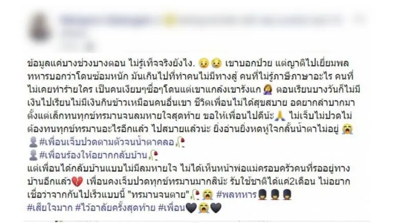ขอให้เพื่อนไปดีนะไม่เจ็บไม่ปวดไม่ต้องทนทุกข์ทรมานอะไรอีกแล้วไปสบายแล้วนะ ยิ่งอ่านยิ่งหดหัวใจกลั้นน้ำตาไม่อยู่ เพื่อนเจ็บปวดตามตัวจนน้ำตาคลอเพื่อนร้องไห้อยากกลับบ้าน แต่เพื่อนได้กลับมาแบบไม่มีลมหายใจไม่ได้เห็นหน้าพ่อแม่ครอบครัวที่เราอยู่ทางบ้านอีกแล้วเพื่อนคงเจ็บปวดทนทุกข์ทรมานมากสินะรับใช้ชาติได้แค่ 2 เดือนไม่อยากเชื่อว่าจะจากไปเร็วแบบนี้ทรมานจนตาย” ซึ่งผู้โพสต์ได้เผยข้อความแชทที่ได้คุยๆ กันกับผู้ที่รู้จักพลทหารรายนี้ว่า เขาถูกซ้อมจนเสียชีวิต