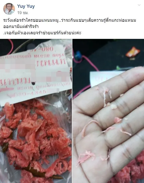 ผู้ใช้เฟซบุ๊กโพสต์ข้อความระบุว่า “ระวังเด้อจร้าใครชอบแหนมหมู..ว่าจะกินแชบๆเสียความรู้สึกแกะห่อแหนมออกมามีแต่สำรีจร้า .เจอกับตัวเองเลยจร้าช่วยแชร์กันด้วยน่ะค่ะ”