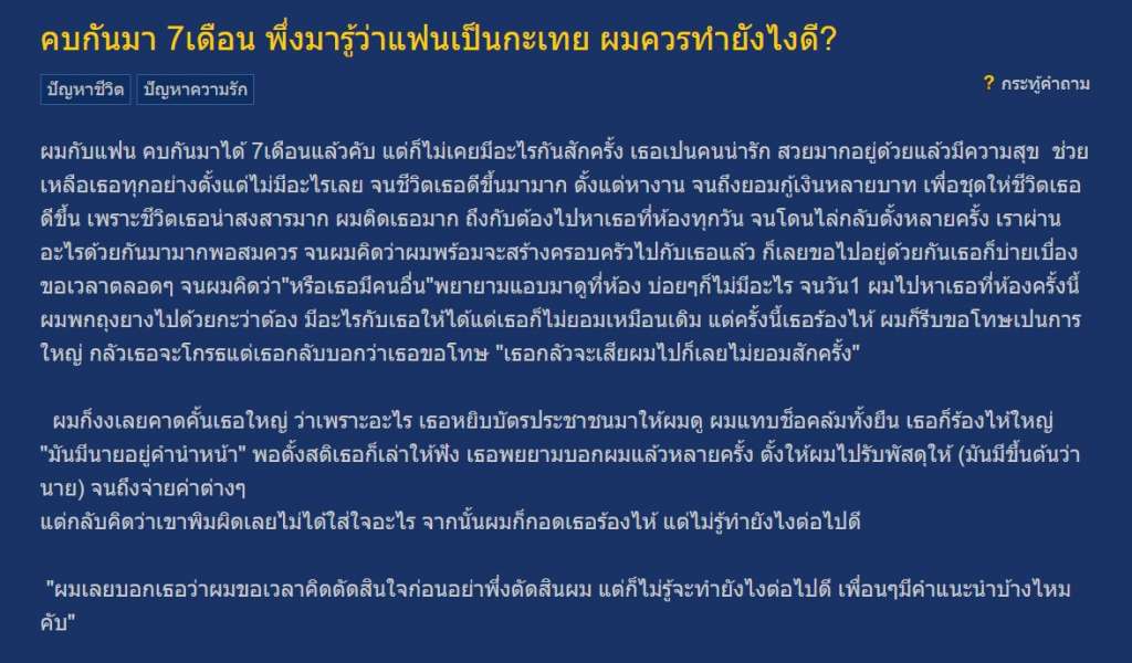 เรียกได้ว่าเป็นเหตุการณ์สุดสะเทือนใจของหนุ่มสมาชิกพันทิปรายหนึ่ง ที่ออกมาตั้งกระทู้ หลังจากที่คบกับแฟนมาได้ 7 เดือน โดยมีเนื้อหาระบุว่า..