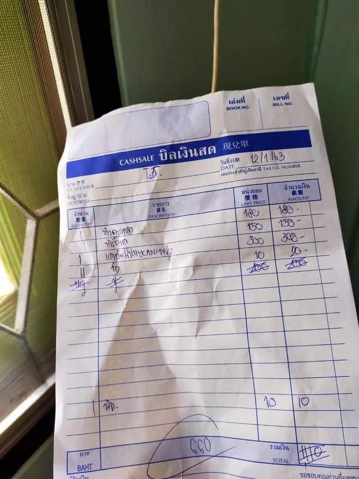 ผู้ใช้เฟซบุ๊กโพสต์ข้อความระบุว่า “ทานอาหารที่ร้าน... แถวคลองวาฬ ต้องระวังนะคะ หากเก็บเงินต้องเรียกใบเสร็จดูไม่งั้นจะโดนของแถมแบบไม่ได้ทาน 400 ตอนแรกก็จะเก็บเงินไม่ยอมให้ดูใบเสร็จแต่ขอดูก็เจอแบบนี้ 555”