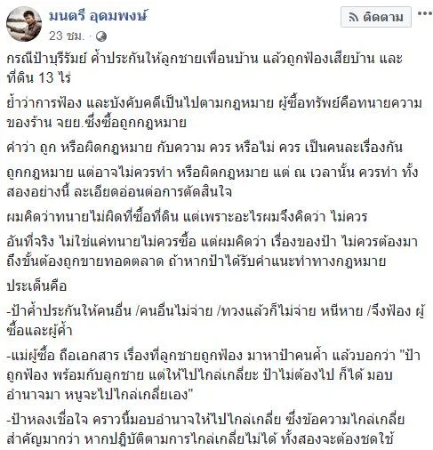 กระทั่งล่าสุด นักข่าวคนดังกล่าวได้โพสต์อีกครั้งว่า “กรณีป้าบุรีรัมย์ ค้ำประกันให้ลูกชายเพื่อนบ้าน แล้วถูกฟ้องเสียบ้าน และที่ดิน 13 ไร่ ย้ำว่าการฟ้อง และบังคับคดีเป็นไปตามกฎหมาย ผู้ซื้อทรัพย์คือทนายความ ของร้าน จยย.ซึ่งซื้อถูกกฎหมาย คำว่า ถูก หรือผิดกฎหมาย กับความ ควร หรือไม่ ควร เป็นคนละเรื่องกัน ถูกกฎหมาย แต่อาจไม่ควรทำ หรือผิดกฎหมาย แต่ ณ เวลานั้น ควรทำ ทั้งสองอย่างนี้ ละเอียดอ่อนต่อการตัดสินใจ