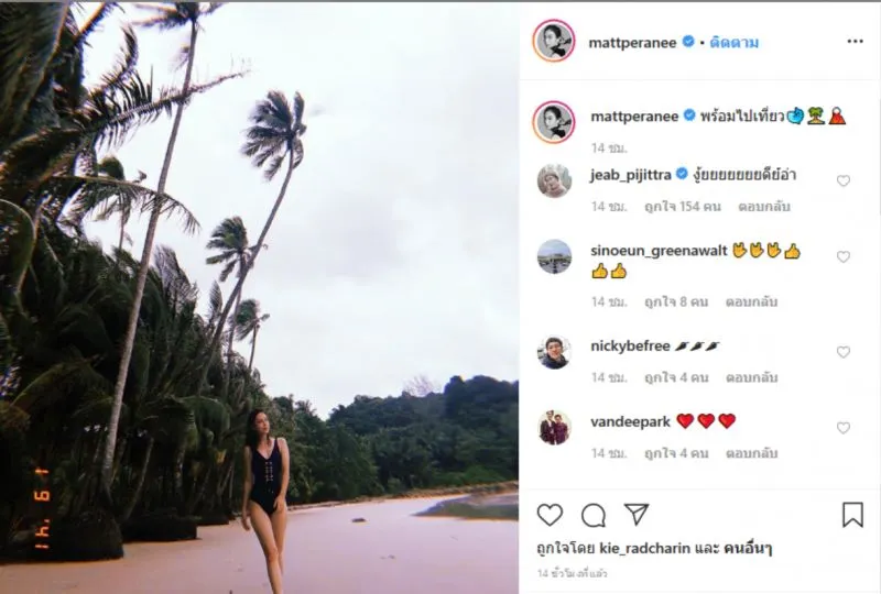 ล่าสุด แมท ภีรนีย์ จัดให้แบบเต็มๆ สายตาเรียกว่าไม่ต้องซูมกันแล้วนะจ๊ะ กับชุดบิกินี่สีดำสุดแซ่บ เดินเล่นสวยๆอยู่ริมชายหาด งานนี้ทำเอาแฟนคลับของสาวแมทที่เข้ามาเห็นต่างกระหน่ำกดไลค์ให้ไปเลยจ้า และหลายๆคนพูดเป็นเสียงเดียวกันเลยว่า แมทเป๊ะมาก