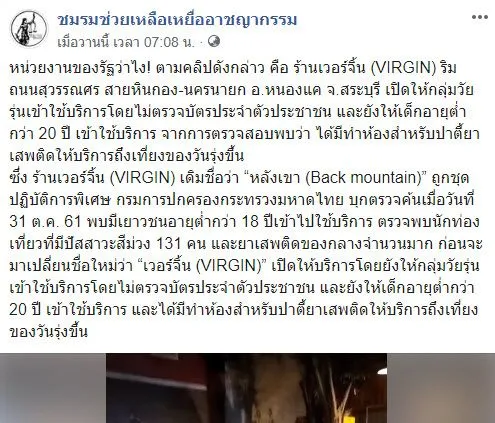 ซึ่ง ร้านเวอร์จิ้น (VIRGIN) เดิมชื่อว่า “หลังเขา (Back mountain)” ถูกชุดปฏิบัติการพิเศษ กรมการปกครองกระทรวงมหาดไทย บุกตรวจค้นเมื่อวันที่ 31 ต.ค. 61 พบมีเยาวชนอายุต่ำกว่า 18 ปีเข้าไปใช้บริการ ตรวจพบนักท่องเที่ยวที่มีปัสสาวะสีม่วง 131 คน และยาเสพติดของกลางจำนวนมาก ก่อนจะมาเปลี่ยนชื่อใหม่ว่า “เวอร์จิ้น (VIRGIN)” เปิดให้บริการโดยยังให้กลุ่มวัยรุ่นเข้าใช้บริการโดยไม่ตรวจบัตรประจำตัวประชาชน และยังให้เด็กอายุต่ำกว่า 20 ปี เข้าใช้บริการ และได้มีทำห้องสำหรับปาร์ตี้ยาเสพติดให้บริการถึงเที่ยงของวันรุ่งขึ้น”