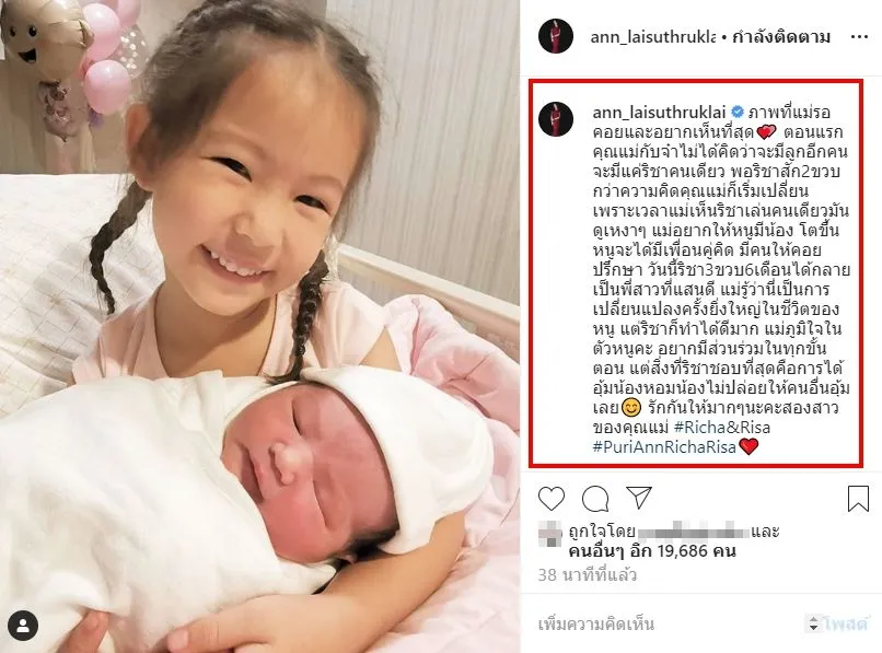 อีกทั้ง สาวแอน อลิชา นั้นก็ได้โพสต์ซึ้งถึงลูกสาวคนโต น้องริชา ถึสาเหตุที่ยอมมีลูกอีกคนเพื่อ น้องริชา! โดยงานนี้ สาวแอน อลิชา ได้โพสต์ะบุข้อความว่า