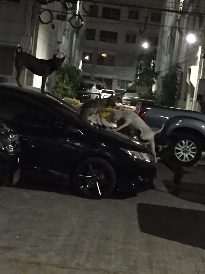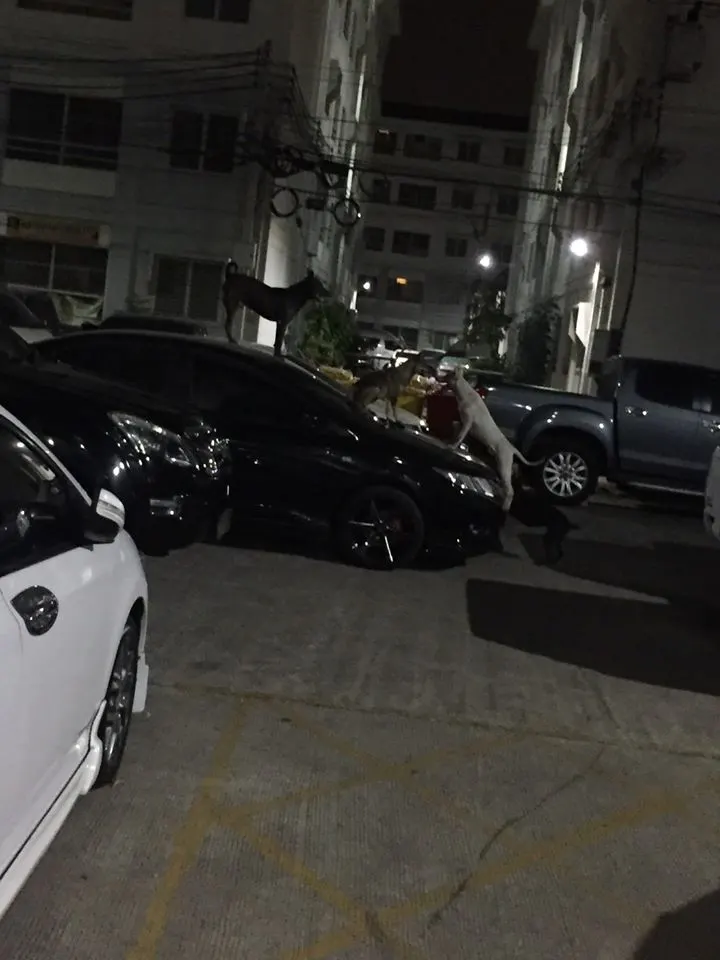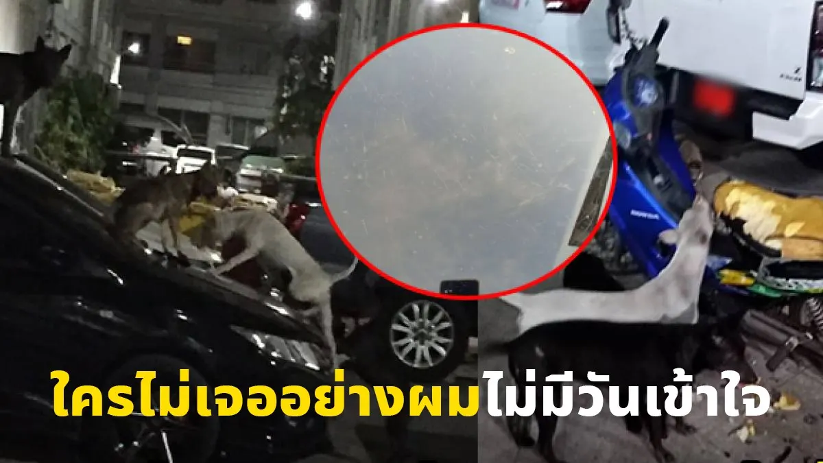 โดยผู้ใช้เฟซบุ๊กรายนี้ยังถามหาคนรับผิดชอบหลังสุนัขกลุ่มนี้ทำลายรถของผู้ที่มาจอดในพื้นที่