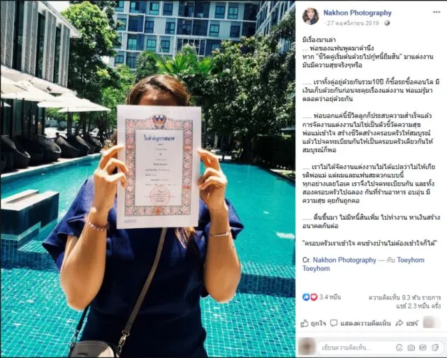 เราไม่ได้จัดงานแต่งงานไม่ได้แปลว่าไม่ให้เกียรติพ่อแม่ แต่ผมและแฟนสะดวกแบบนี้ ทุกอย่างเลยโอเค เราจึงไปจดทะเบียนกัน และทั้งสองครอบครัวไปฉลอง กันที่ร้านอาหาร อบอุ่น มีความสุข คุยกันถูกคอ ตื่นขึ้นมา ไม่มีหนี้สินเพิ่ม ไปทำงาน หาเงินสร้างอนาคตกันต่อ ครอบครัวเราเข้าใจ คนข้างบ้านไม่ต้องเข้าใจก็ได้