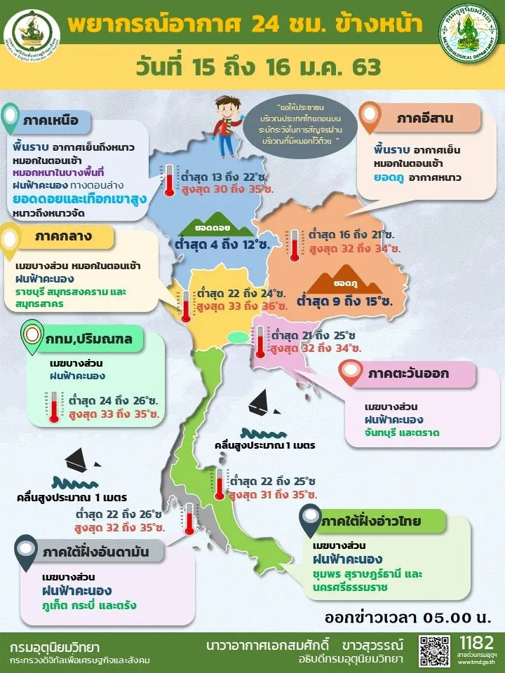 พยากรณ์อากาศประจำวันที่ 15 มกราคม 2563 ลักษณะอากาศทั่วไป พยากรณ์อากาศ 24 ชั่วโมงข้างหน้า ประเทศไทยตอนบนมีหมอกในตอนเช้าและมีหมอกหนาบางพื้นที่ ในตอนกลางวันมีแสงแดดจัด บริเวณพื้นราบของภาคเหนือและภาคตะวันออกเฉียงเหนือยังคงมีอากาศหนาวเย็นในตอนเช้า ส่วนยอดดอยและยอดภูมีอากาศหนาวถึงหนาวจัด ขอให้ประชาชนบริเวณประเทศไทยตอนบนระวังการสัญจรผ่านบริเวณที่มีหมอกหนาไว้ด้วย สำหรับภาคตะวันออก ภาคกลาง รวมทั้งกรุงเทพมหานครและปริมณฑลมีฝนฟ้าคะนองเกิดขึ้นในระยะนี้ ส่วนภาคใต้มีฝนน้อย