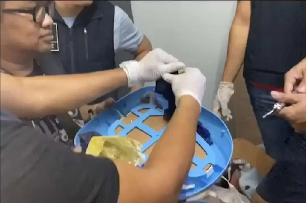 จากการตรวจค้นเบื้องต้นพบยาไอซ์ประมาณ 100 กรัม และยาบ้าอีกประมาณ 2,000 เม็ด บรรจุอยู่ในถุงเท้าสีดำ-เทายัดไว้ใต้พัดลมยี่ห้อ แฟมมิลี่ สีขาวฟ้า จึงตรวจยึดไว้เป็นพยานหลักฐาน โดยเตรียมแจ้งข้อหา “มียาเสพติดให้โทษประเภทที่ 1 ยาไอซ์และยาบ้าไว้ในครอบครองเพื่อจำหน่ายโดยผิดกฎหมายเพิ่มเติมและขยายผลต่อไป