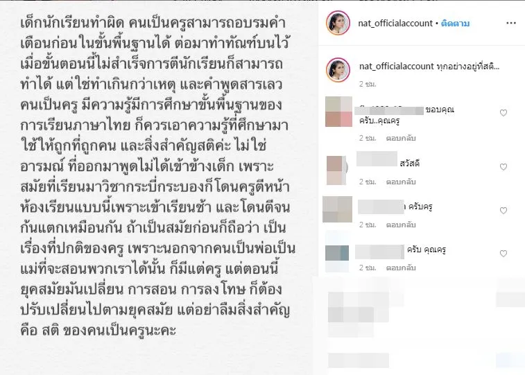 แนท เกศริน โพสต์เตือนสติ ปมดราม่าครูฟาดไม้เรียวไม่ยั้งเด็กนักเรียน