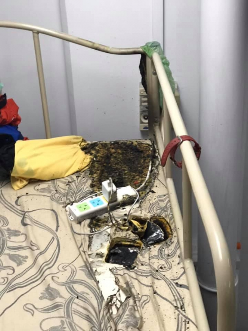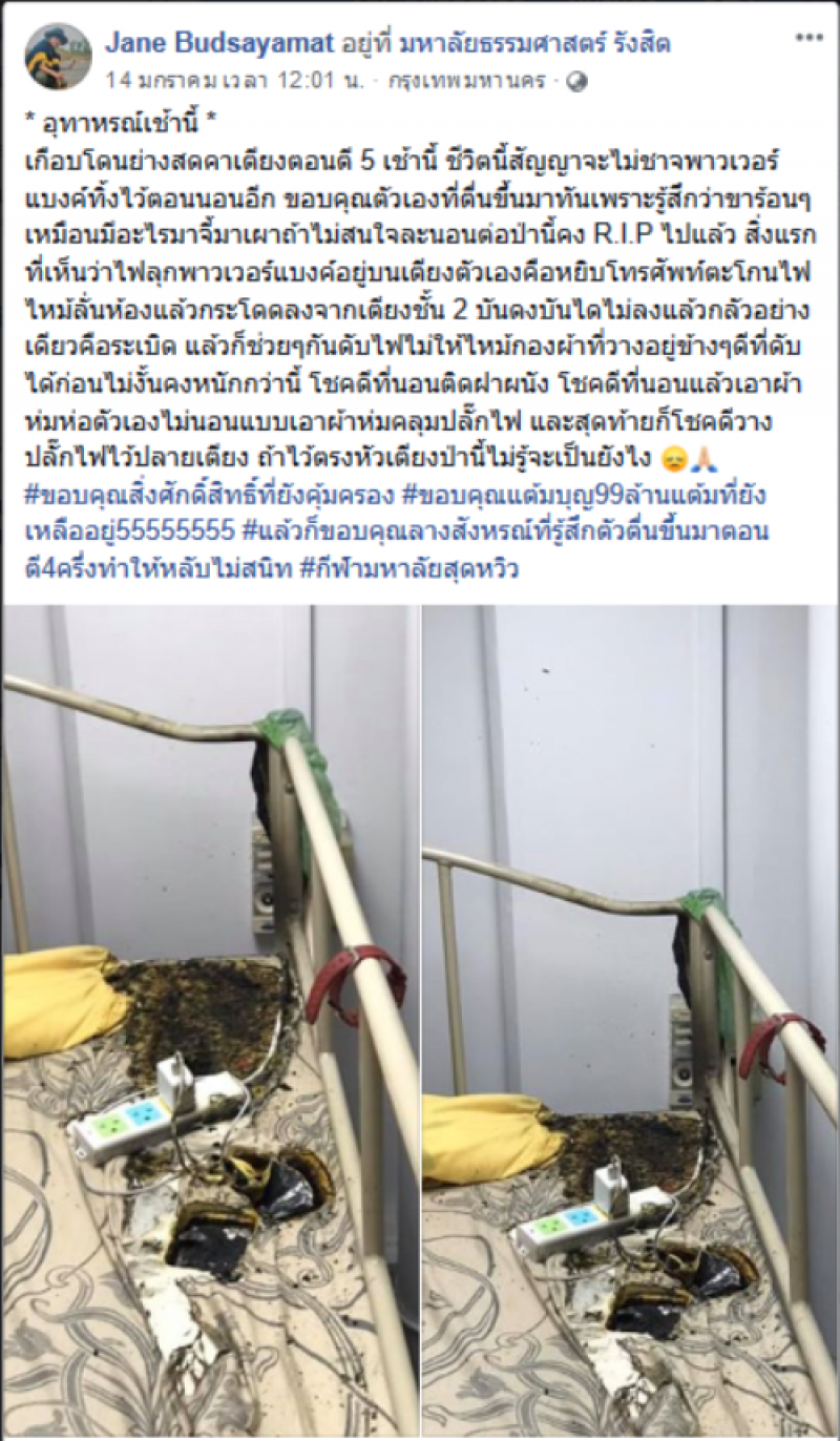 เมื่อวันที่ 16 มกราคม ได้มีผู้ใช้เฟซบุ๊ค อีกเรื่องราวเตือนภัยสำหรับคนที่ชอบ ชาร์จมือถือ หรือพาวเวอร์แบงค์ ไว้บนที่นอน ทิ้งไว้ตอนกลางคืน แต่ตกดึกพาวเวอร์แบงค์เกิดไฟลุกขึ้นไม่ทราบสาเหตุ ซึ่งผู้โพสต์ระบุว่า