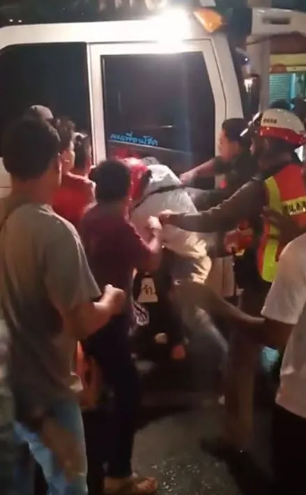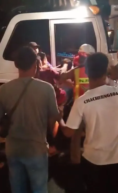 หนุ่มขับรถทัวร์ เลือดร้อน ขับรถไล่ชนแท๊กซี่ รถมอเตอร์ไซค์ ชาวบ้านช่วยกันไล่จับพร้อมรุมประชาทัณฑ์