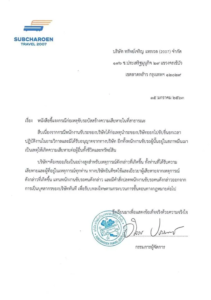 ต่อมา บริษัทเจ้าของรถทัวร์ ออกแถลงการณ์ขอโทษ รับผิดชอบผู้เสียหายทุกราย ให้คนขับรถทัวร์ที่ก่อเหตุพ้นสภาพพนักงาน