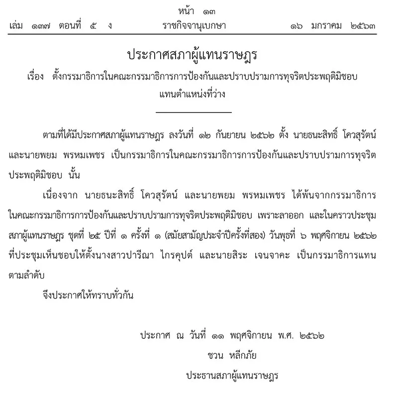 ผู้สื่อข่าวรายงานว่าเมื่อวันที่ 16 มกราคม 2563 เว็บไซต์ราชกิจจานุเบกษา เผยแพร่ ประกาศสภาผู้แทนราษฎร เรื่อง ตั้งกรรมาธิการ ในคณะกรรมาธิการการป้องกันและปราบปรามการทุจริตประพฤติมิชอบ แทนตําแหน่งที่ว่าง ความว่า