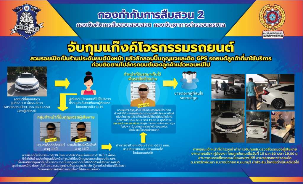 และบางคันที่เป็นลูกค้าจร นายสรศักดิ์หรือเบียร์ ธีรเวชสุนทรและนายชัยวัฒน์หรือสิงห์ ธีรเวชสุนทร จะแอบติดจีพีเอสติดเพื่อติดตามได้ว่ารถยนต์ของลูกค้าไปจอดที่ใดเพื่อที่จะหาโอกาสเหมาะใช้กุญแจที่ทำการก็อปปี้ไว้เปิดประตูและขับไปให้นายธนัย จิวการดี