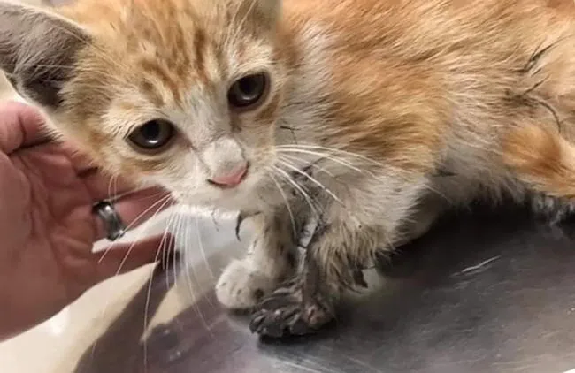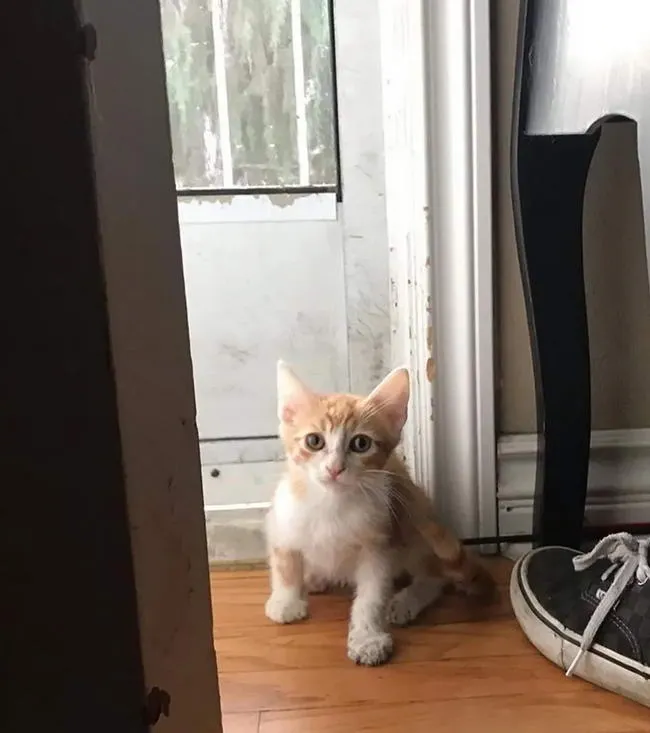 เจ้าของร้านขายไม้มีชื่อว่า Justin LaRose ได้ยินเสียงร้องที่ราวกับอ้อนวอนให้ช่วยของเจ้าตัวน้อย และพบว่ามันกำลังใช้อุ้งเท้าเล็กๆตะกุยผนังพยายามที่จะเข้ามาในร้าน Justin เล่าว่า “ตัวของมันเต็มไปด้วยคราบสี ผมได้ยินเสียงร้องของมันครั้งหนึ่งแล้วรู้เลยว่า นี่มันไม่ปกติ ลูกแมวต้องการความช่วยเหลืออย่างมาก” เขาอุ้มลูกแมวขึ้นมาแล้วพบว่ามันช่างสกปรกและซูบผอมเอามากๆ เจ้าตัวเล็กก็เริ่มส่งเสียง Purr อย่างมีความสุข มันแสดงออกว่ารู้สึกดีที่ได้รับความช่วยเหลือ
