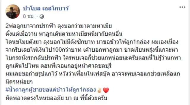 เป็นเรื่องราวที่เมื่อถูกเผยแพร่ออกไปก็ทำให้หลายๆคนต้องเกิดความสงสารเห็นใจ เมื่อหนุ่มคนหนึ่งได้พาบุตรชายออกตามหาแฟน เมื่อวันที่ 17 มกราคม 63 ผู้ใช้เฟสบุ๊คชื่อว่า ปาโบล เอสโกบาร์ ได้โพสต์ข้อความระบุว่า 2 คนนี้มาจากปรกฟ้า ลุงบอกว่ามาตามหาแฟน ตั้งแต่เมื่อวาน พาบุตรชายเดินตามหาแฟนหนีมากับคนอื่น โดนขโมยตังมา ลุงบอกไม่มีตังซักบาท มาขอข้าวไห้บุตรชายกิน 1กล่อง ผมเองเนื่องจากรีบเลยไห้เงินไป100กว่าบาท เค้าบอกพาบุตรชายมา ขาดเรียนพรุ่งนี้แกจะหาโบกรถนั่งรถกลับปรกฟ้า ใครพบเจอก็ช่วยแกหน่อยนะครับตอนนี้ไม่รู้ว่าแกพาบุตรชายเดินไปไหน ตอนที่เจอแกอยู่หน้าศาลชลบุรี ผมเลยขอถ่ายรูปแกไว้ หวังว่าเพื่อนในเฟสบุ๊ค อาจจะพบเจอแกช่วยเหลือแกนิดๆหน่อยๆ