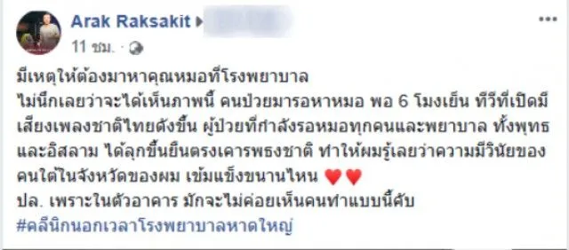 เป็นเรื่องราวที่เห็นแล้วก็อดปลื้มใจไม่ได้จนต้องนำมาฝากเพื่อนๆ นั่นก็คือภาพของคนที่ไม่สบายไปหหมอ แต่พอเพลงชาตดังขึ้นทุกคนกับพร้อมใจกันยืนตรงเคารพธงชาติ แม่ว่าจะไม่สบายอยู่ก็ตาม เมื่อวันที่ 17 มกราคม ผู้ใช้เฟสบุ๊คชื่อ Arak Raksakit ได้โพสต์ข้อความระบุว่า มีเหตุให้ต้องมาหาคุณหมอที่โรงบาล ไม่นึกเลยว่าจะได้เห็นภาพนี้ คนไม่สบายมารอหาหมอ พอ 6 โมงเย็น ทีวีที่เปิดมีเสียงเพลงชาติไทยดังขึ้น ผู้ไม่สบายที่กำลังรอหมอทุกคน ทั้งพุทธและอิสลาม ได้ลุกขึ้นยืนตรงเคารพธงชาติ ทำให้ผมรู้เลยว่าความมีวินัยของคนใต้ในจังหวัดของผม เข้มแข็งขนาดไหน ปล เพราะในตัวอาคาร มักจะไม่ค่อยเห็นคนทำแบบนี้คับ คลีนิกนอกเวลาโรงบาลหาดใหญ่