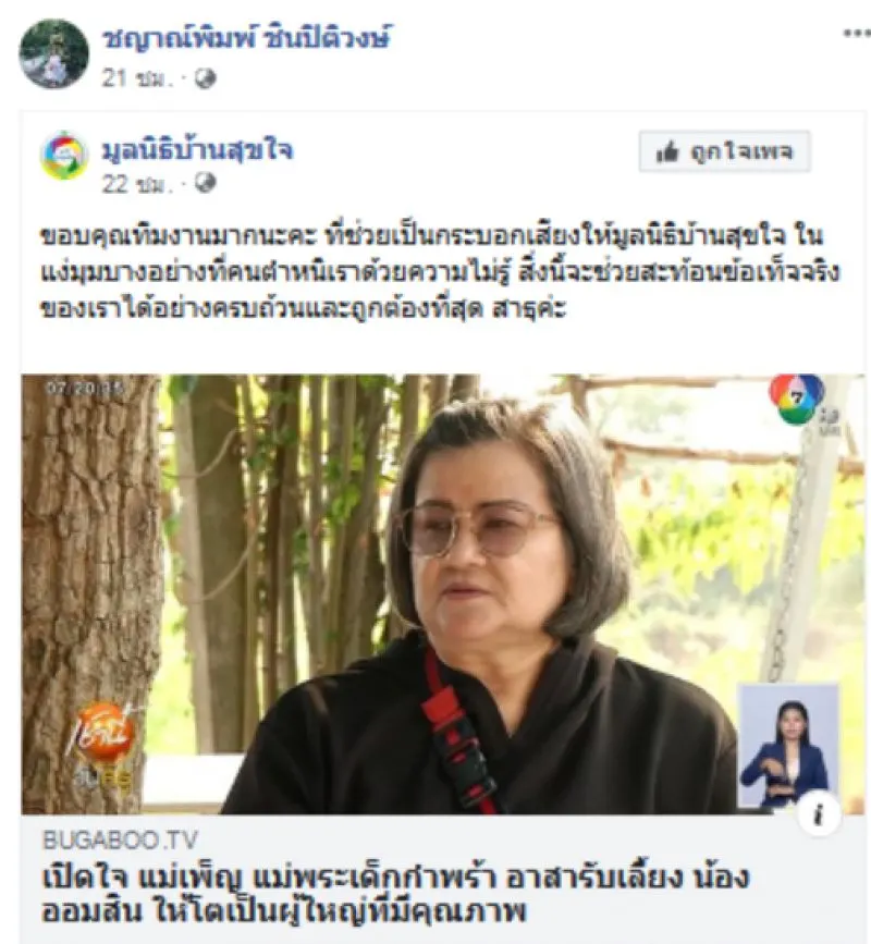 โดยแม่เพ็ญ ปัจจุบันดำรงตำแหน่งประธานมูลนิธิบ้านสุขใจ ตำบลตากฟ้า อำเภอตากฟ้า จังหวัดนครสวรรค์ ตนรับอุปการะหนูน้อยมาเกือบ 20 ปี และได้ทำการจดทะเบียนในนามนิติบุคคลเพื่อดำเนินการมูลนิธิอย่างถูกกฎหมายช่วง 2 ปีที่ผ่านมา ปัจจุบันมีในความดูแล 15 คน