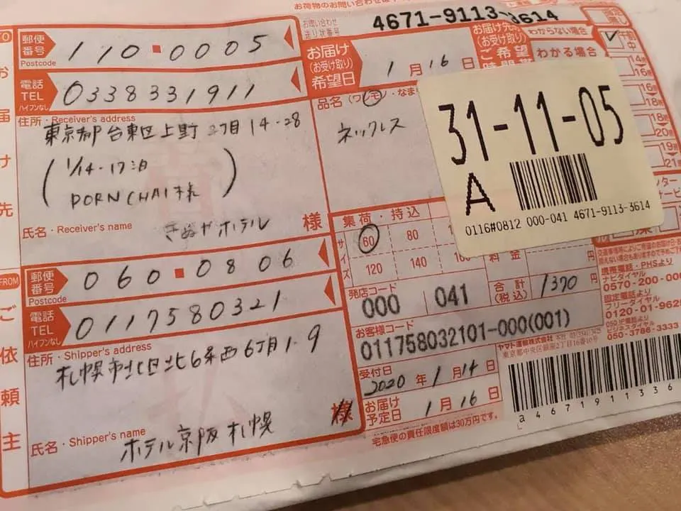 หลังจากนั้นเค้าก็ถามรายละเอียดของที่ลืมไว้จริงจังมากขึ้น ทั้งๆ ที่เราส่งอีเมล์รายละเอียดต่างๆ ไปแล้ว 4 ครั้ง พอถามรายละเอียดเสร็จเค้าก็ตอบมาทันทีว่าเจอแล้ว และเค้าถามรายละเอียดการจัดส่ง เราจึงให้ส่งมาโรงแรมที่เราจะย้ายไปพักที่โตเกียว โดยมีค่าส่ง 1500 เยน