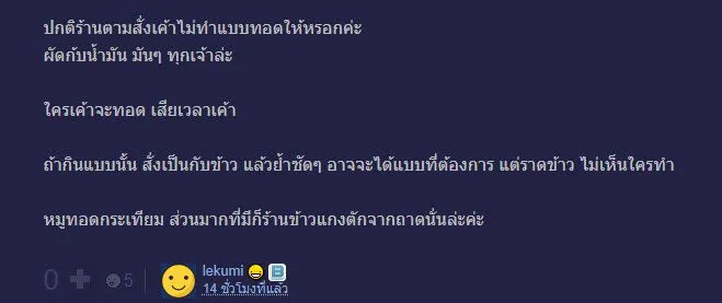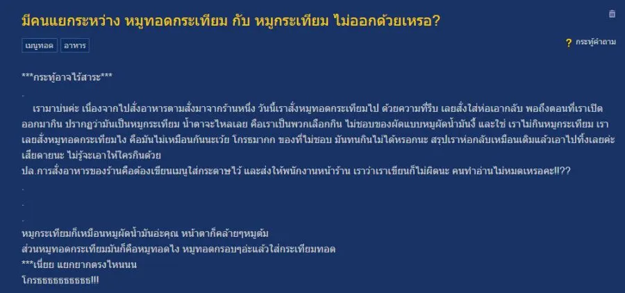 โดยเจ้าของกระทู้เล่าว่า.. เรามาบ่นค่ะ เนื่องจากไปสั่งอาหารตามสั่งมาจากร้านหนึ่ง วันนี้เราสั่งหมูทอดกระเทียมไป ด้วยความที่รีบ เลยสั่งใส่ห่อเอากลับ พอถึงตอนที่เราเปิดออกมากิน ปรากฏว่ามันเป็นหมูกระเทียม น้ำตาจะไหลเลย คือเราเป็นพวกเลือกกิน ไม่ชอบของผัดแบบหมูผัดน้ำมันงี้ และใช่ เราไม่กินหมูกระเทียม เราเลยสั่งหมูทอดกระเทียมไง คือมันไม่เหมือนกันนะเว้ย โกรธมากก ของที่ไม่ชอบ มันทนกินไม่ได้หรอกนะ สรุปเราห่อกลับเหมือนเดิมแล้วเอาไปทิ้งเลยค่ะ เสียดายนะ ไม่รู้จะเอาให้ใครกินด้วย