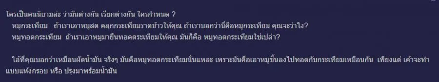 ทั้งนี้เจ้าตัวยังบอกอีกว่า "หมูกระเทียมก็เหมือนหมูผัดน้ำมันอ่ะคุณ หน้าตาก็คล้ายๆหมูต้ม
