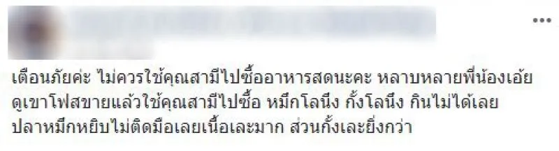 “เตือนภัยค่ะ ไม่ควรใช้คุณสามีไปซื้ออาหารสดนะคะ หลาบหลายพี่น้องเอ้ย ดูเขาโฟสแล้วใช้คุณสามีไปซื้อ หมึกโลนึง กั้งโลนึง กินไม่ได้เลย ปลาหมึกหยิบไม่ติดมือเลยเนื้อเละมาก ส่วนกั้งเละยิ่งกว่า”