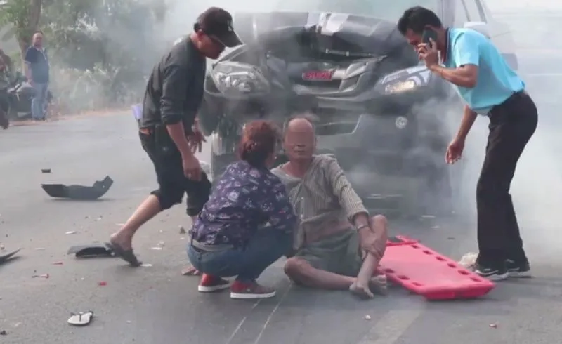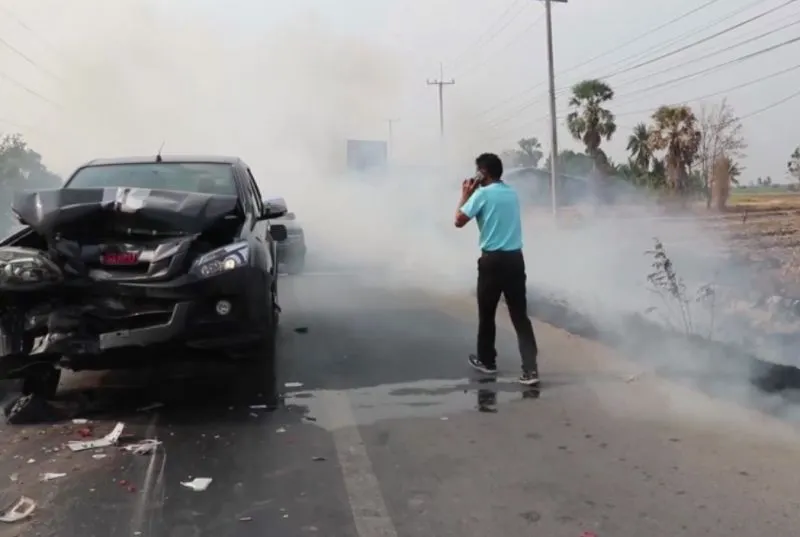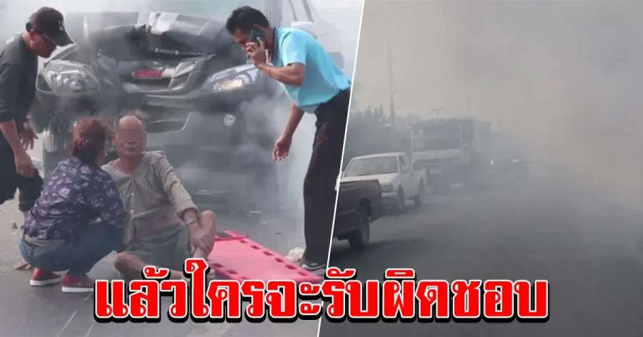 ชาวบ้านเผาหญ้าข้างทาง ทำรถชนสนั่น 7 คันรวด
