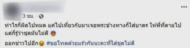 ล่าสุดทางด้านสาวที่อยู่ในภาพดังกล่าว ได้ออกมาโพสต์เฟซบุ๊กขอโทษสังคมแล้ว โดยระบุว่า “ทำไรก็ผิดไปหมด แค่ไปเที่ยวกลับมา เจอพระข้างทางก็ใส่บาตรให้พี่ที่ตายไป แต่ก็รู้ว่าชุดมันไม่ดี ออกข่าวไปอีก ขอโทษด้วยแล้วกันนะคะที่ใส่ชุดไม่ดี”