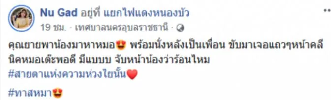 เป็นอีกหนึ่งเรื่องราวสุดประทับใจ เมื่อคุณยายพาน้องหมามาหาหมอที่คลีนิค พร้อมกับนั่งหลังกระบะเป็นเพืื่อน ซึ่งทำเอาคนรักหมาเห็นถึงความห่วงใยของยาย ยายได้เอามือจับหน้าน้องหมา เหมือนกับว่า ร้อนไหม โดยผู้ใช้เฟสบุ๊ค Nu Gad ได้โพสต์ข้อความระบุว่า
